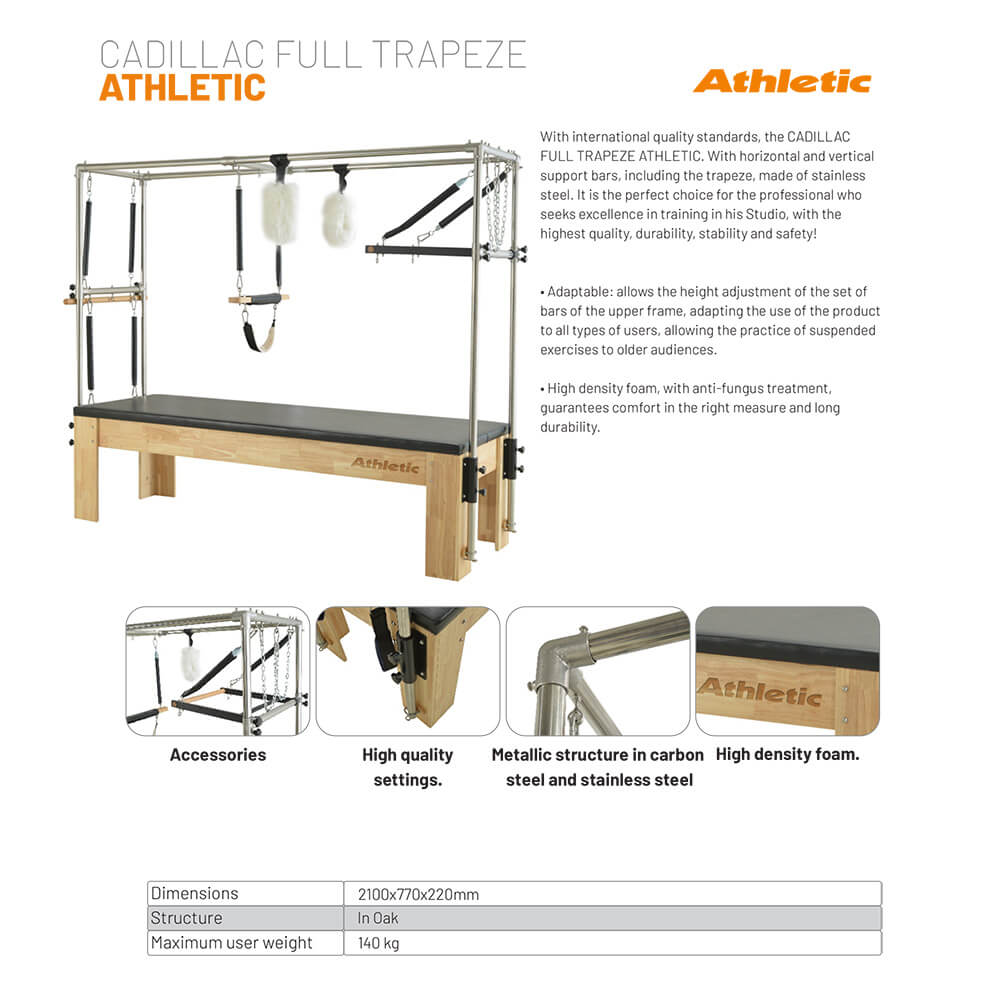With international quality standards, the CADILLAC FULL TRAPEZE ATHLETIC. With horizontal and vertical support bars, including the trapeze, made of stainless steel. It is the perfect choice for the professional who seeks excellence in training in his Studio, with the highest quality, durability, stability and safety! • Adaptable: allows the height adjustment of the set of bars of the upper frame, adapting the use of the product to all types of users, allowing the practice of suspended exercises to older audiences. • High density foam, with anti-fungus treatment, guarantees comfort in the right measure and long durability.”