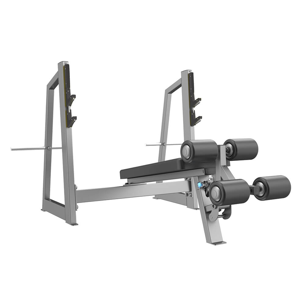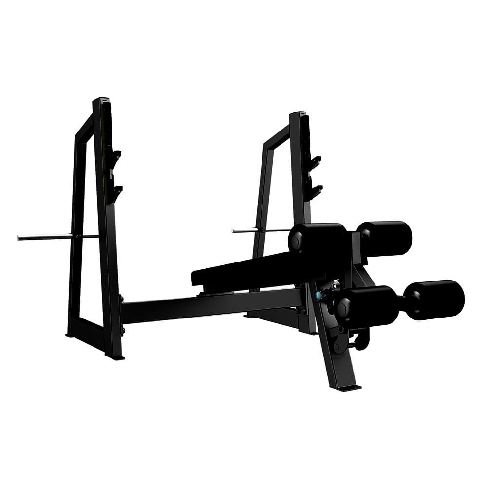 WITH A MODERN DESIGN AND ATTENTIVE TO DETAILS, THE OLYMPIC DECLINE BENCH HAS FINISHING CAPS INJECTED IN FLEXIBLE PVC, PREVENTING THEM FROM COMING LOOSE FROM THE TUBE AND LEAVING THE EQUIPMENT UNFINISHED, AND IN ADDITION TO IMPROVING THE AESTHETIC APPEARANCE, IT ALSO PREVENTS CORROSION. ANTICORROSIVE TREATMENT THROUGH PHOSPHATIZATION BATHS, ELECTROSTATIC PAINTING IN DOUBLE LAYER POLYESTER AND FIXATION IN AN OVEN AT 200°C. •ORTHOPEDIC FOAM PADDING INJECTED INTO A MOLD SPECIFICALLY DESIGNED FOR FITNESS. •UPHOLSTERY BACK CABLING WITH DOUBLE LAYER IN ROTO MOLDED POLYETHYLENE, PREVENTING BREAKAGE. •SUPPORT OF THE EQUIPMENT ON THE INJECTED PVC FLOOR, RAISING THE STRUCTURE, AVOIDING CONTACT BETWEEN THE BASE AND THE FLOOR, FACILITATING CLEANING AND PREVENTING CONTACT WITH MOISTURE.