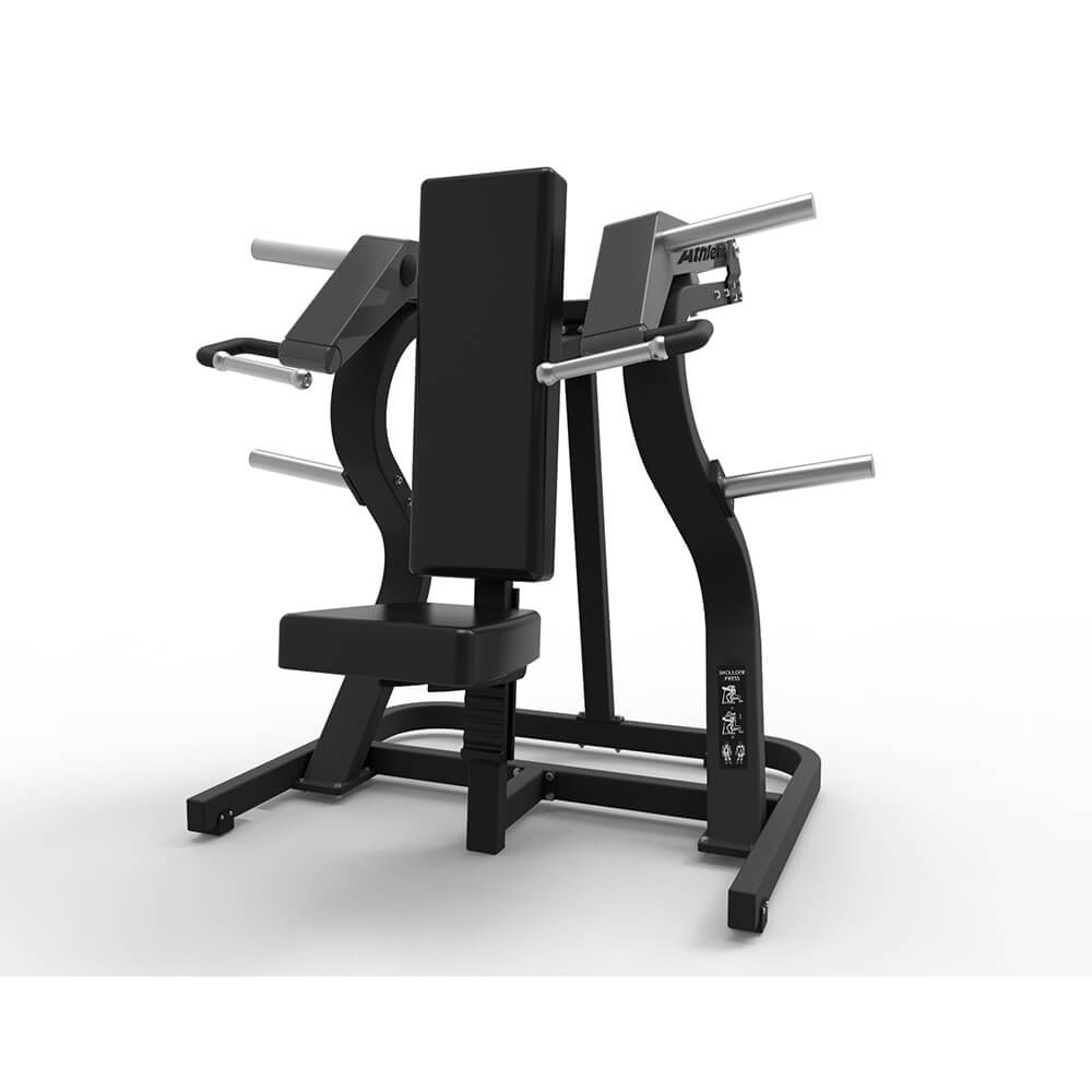 THE MOVEMENT ON THE SHOULDER PRESS MACHINE MIMICS LIFTING WEIGHTS OVERHEAD IN THE FRONTAL PLANE AND IS IDEAL FOR DEVELOPING THE DELTOID, TRICEPS AND UPPER TRAPEZIUS MUSCLES. HIGH-DURABILITY MATERIAL, 3MM THICK. WITH ALUMINUM HANDLE AND WEIGHT STACK SUPPORT, IT PREVENTS RUST AND PROVIDES GREATER DURABILITY TO THE EQUIPMENT.”
