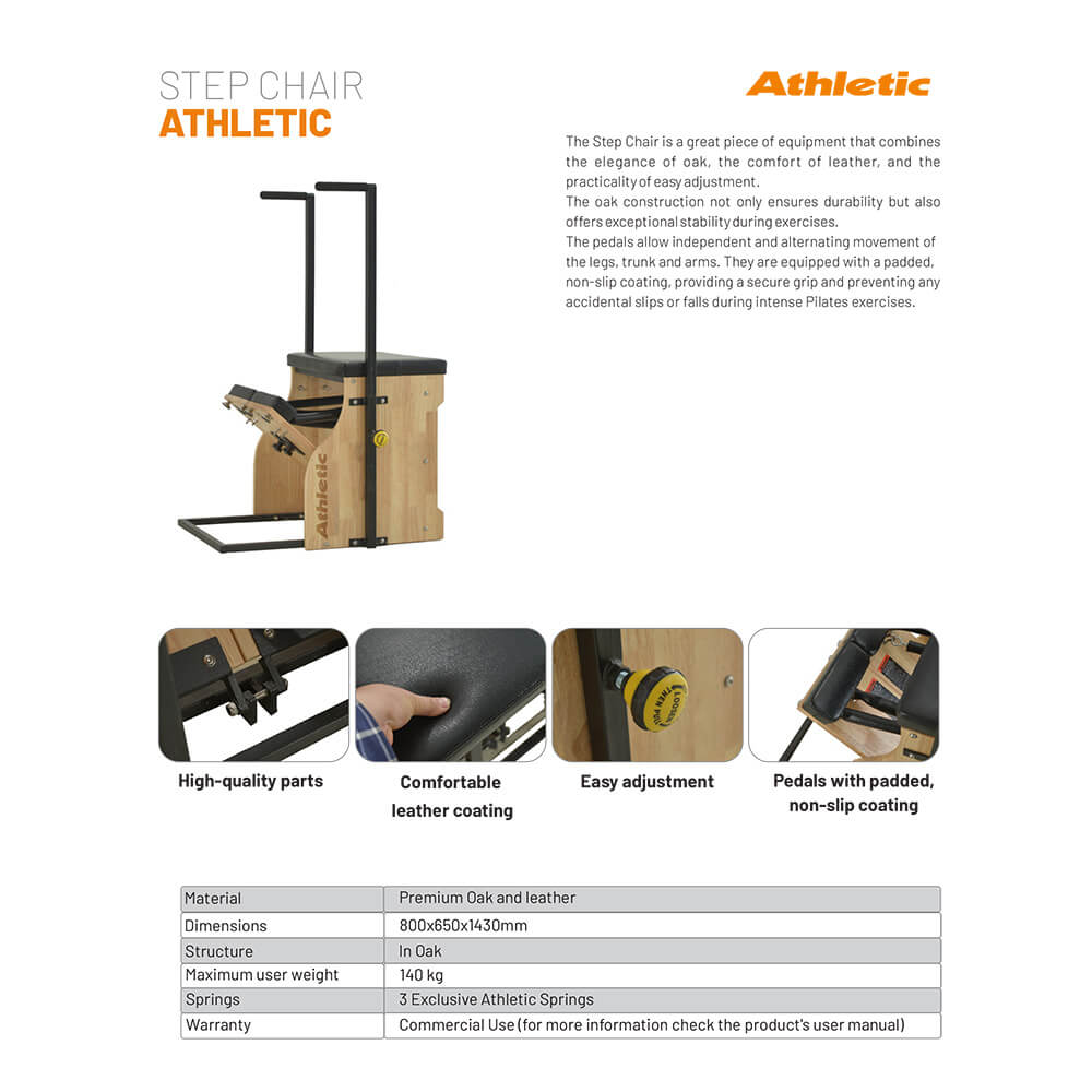 The Step Chair is a great piece of equipment that combines the elegance of oak, the comfort of leather, and the practicality of easy adjustment. The oak construction not only ensures durability but also offers exceptional stability during exercises. The pedals allow independent and alternating movement of the legs, trunk and arms. They are equipped with a padded, non-slip coating, providing a secure grip and preventing any accidental slips or falls during intense Pilates exercise
